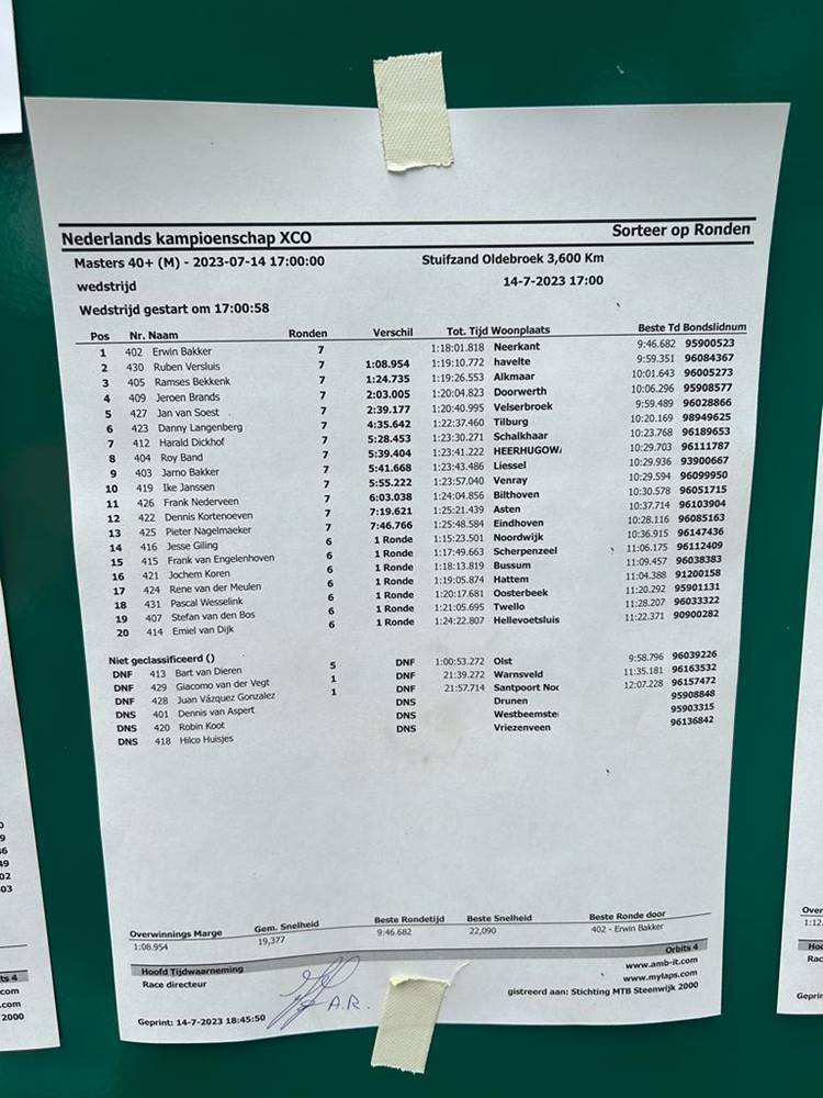 Jarno is zo goed in vorm dat hij vrijdag 14 juli 2023 ook deelneemt aan NK mountainbike, sportklasse. Hij eindigt hier bij de eerste 10, namelijk 9e.