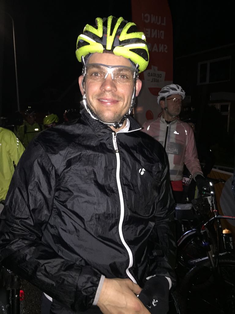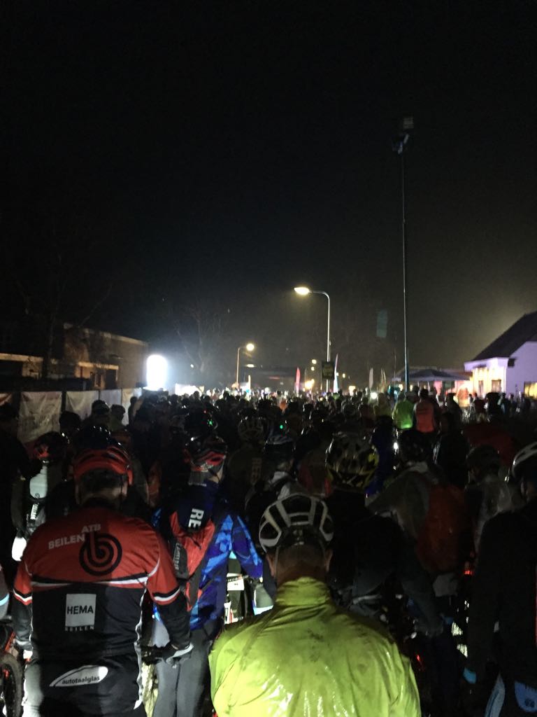 Met startnummer 177 ging ik op pad. Het was donker en het regende, maar met lamp en regenjas was ik goed voorbereid. Na 10 minuten fietsen zag ik een geweldig mooi beeld van allemaal fietslichtjes die in de donker hun weg zochten.