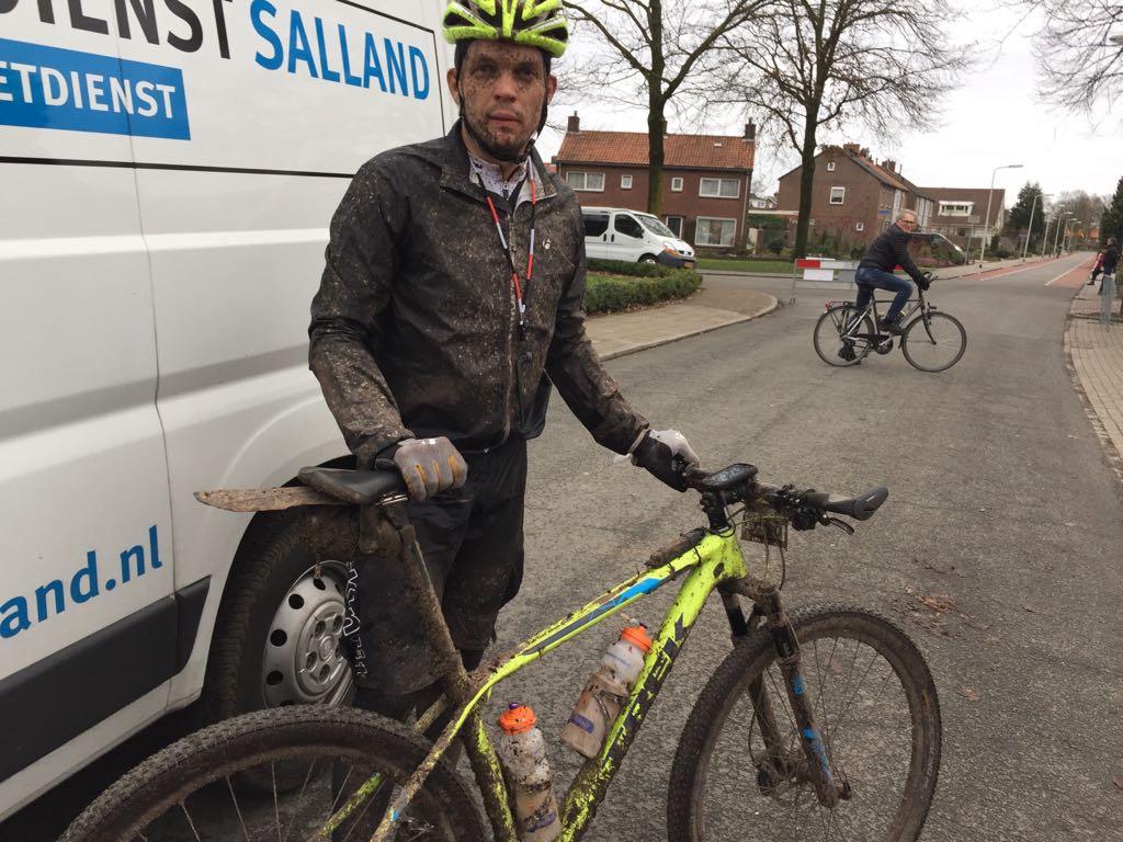 Hier werd ik goed verzorgd door Harrie die mij vol stopte met cola en eten. Mijn fiets was inmiddels een paar kilo zwaarder van de modder en de ketting piepte en knarste. Het materiaal werd zwaar op de proef gesteld. De laatste 20 km gingen als vanzelf. Ik had vleugels en voelde me beresterk. Een jongen uit België vroeg of hij met mij mee naar de finish mocht. Hij zat er mentaal en fysiek doorheen. Samen hebben we de laatste 20 km al pratend gefietst. 5 km voor de finish zette hij zijn bril weer op. Ik vroeg waarom? Hij zei: "als ik dadelijk over de finish kom moet ik wenen". Geweldig! Dit zijn prachtige momenten tijdens zo'n toertocht.