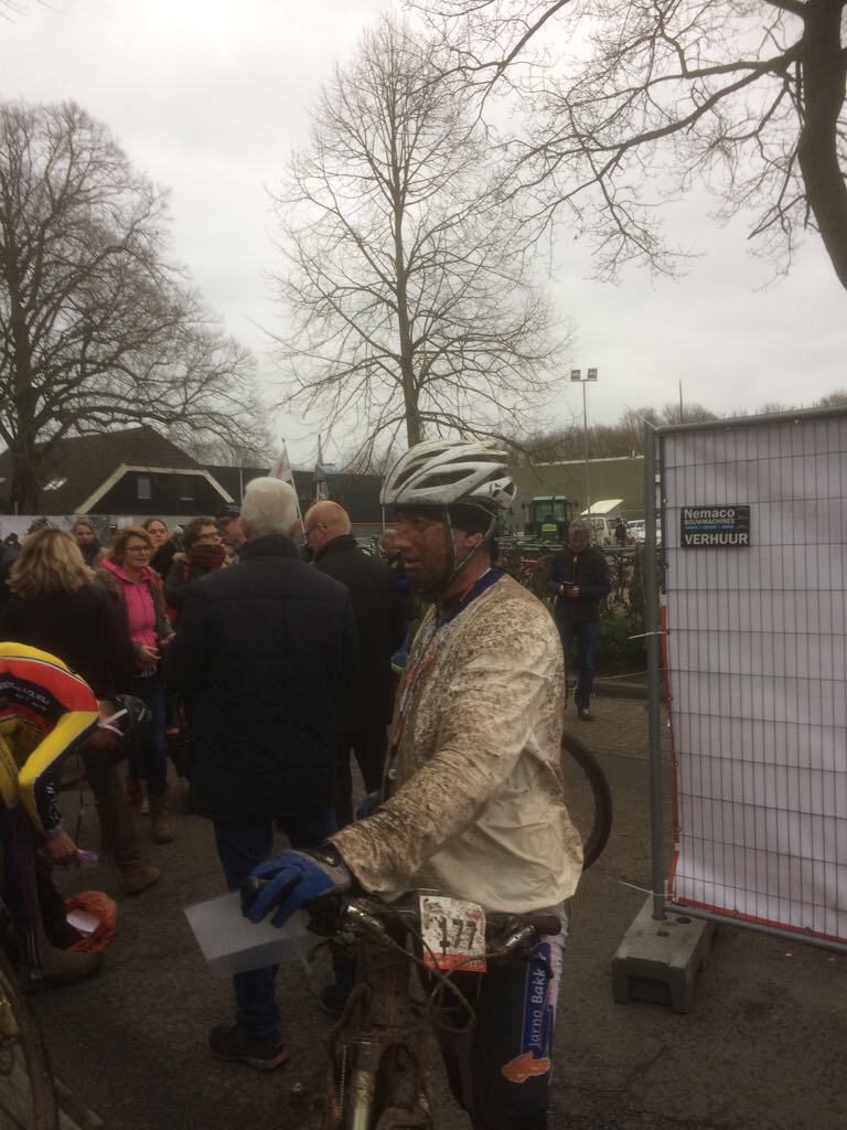 De laatste km is aangebroken. Uit het bos de harde weg op. We ruiken de finish. De spieren worden nog eens gespannen, mijn tellertje geeft 35 km/uur aan. Nondeknetter denk ik. Door de hekken.................. Ik vlieg bij de finish bijna aan de achterkant van het schavot af, gelukkig werken mijn remmen nog. De mat krult helemaal op. Hohoho roepen ze...........