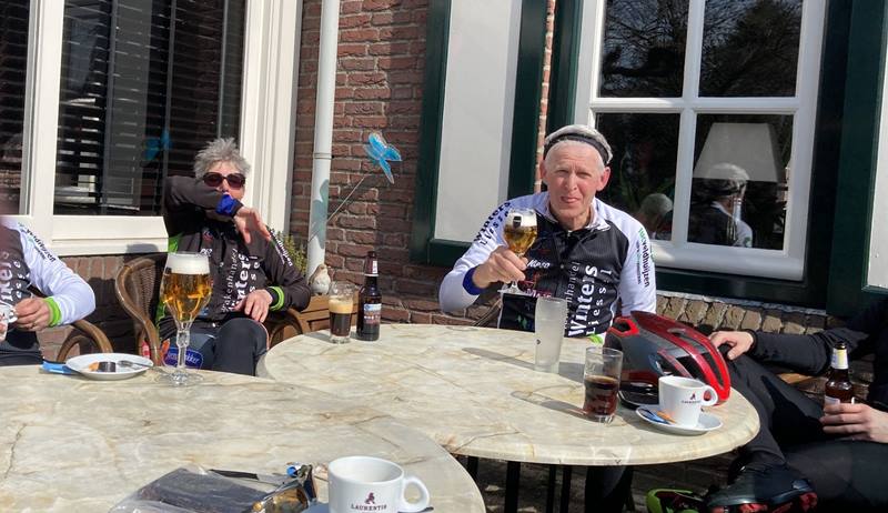 Bij vertrek nog wat fris, maar na afloop weer genieten in het zonnetje (bij cafe De Hoofdzaak) .....