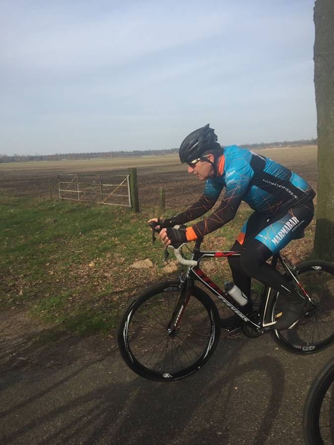 Omdat de eerste rit op de weg andere jaren altijd pas in maart is, heeft Leon zijn "tenue voor op de weg" nog niet gereed. Vandaar dat hij de kleren voor de atb-ritten nog maar heeft aangetrokken.