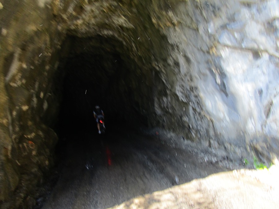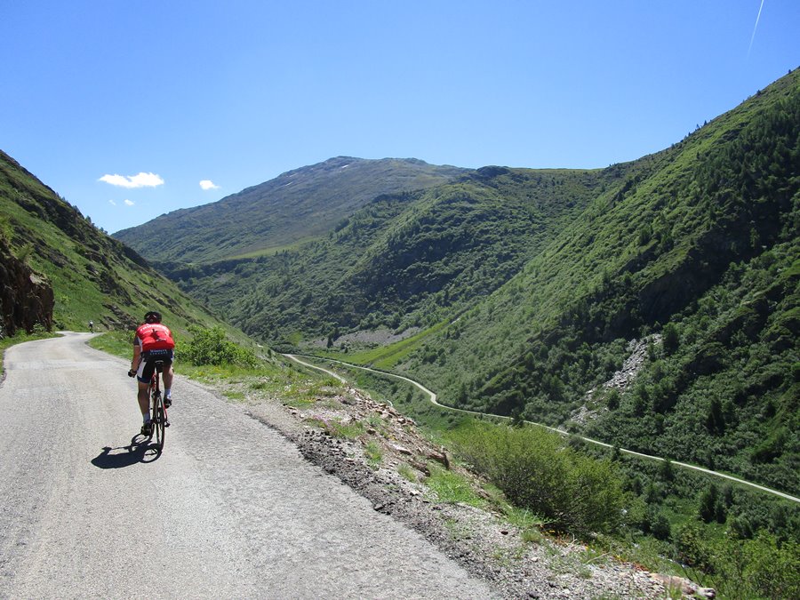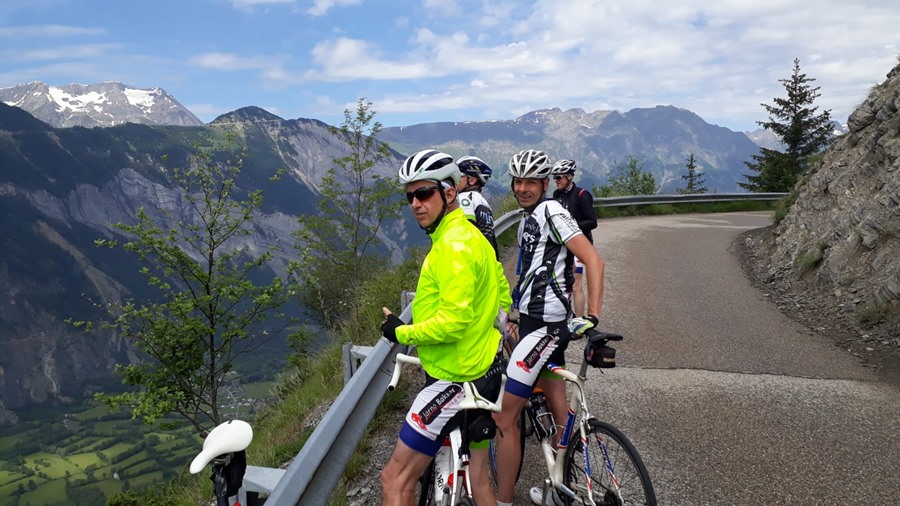 We beginnen de eerste fietsdag met de Col du Solude: in het centrum van Bourg-d'Oisans gaan we meteen bergop naar Villard-Notre-Dame. De klim gaat over een oud smal bergwegje, half uitgehakt in de rotsen, door een paar totaal onverlichte tunnels. Boven op de top heb je een mooi zicht op de Alp d'Huez. Cor gaat zelfs een stuk de weide in om een nog beter zicht te hebben.