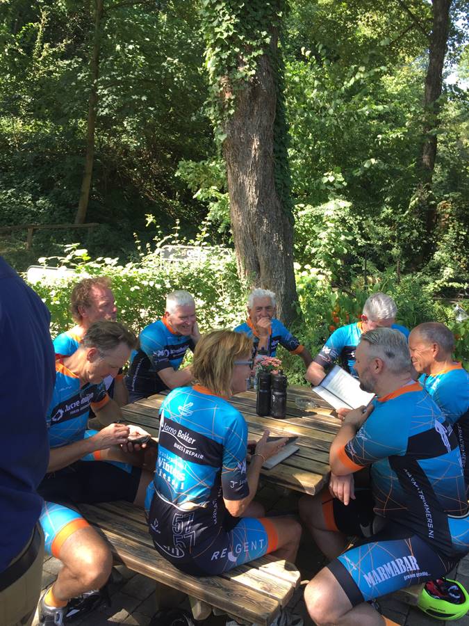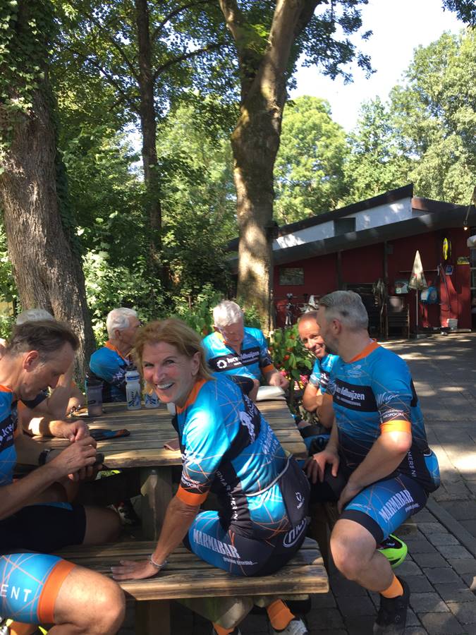 Om 17.15 uur komen we terug in Liessel en is 185 km gefietst. Hier wordt bij de Marmabar nog wat gedronken: een welkome verfrissing met de hitte. Vanaf het terras worden de Marmatrimmers uitgezwaaid die om 18.00 uur een rondje gaan fietsen.