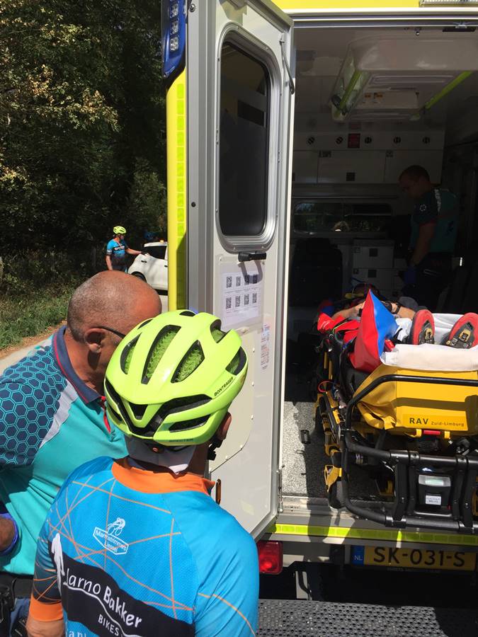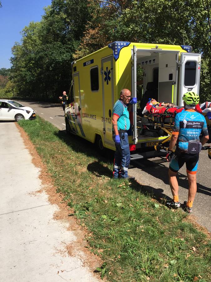 Net na de brug van Elsloo is er een valpartij met meerdere renners. Martien komt hier onfortuinlijk ten val. Helaas moeten we de rit vervolgen met 1 fietser minder.
